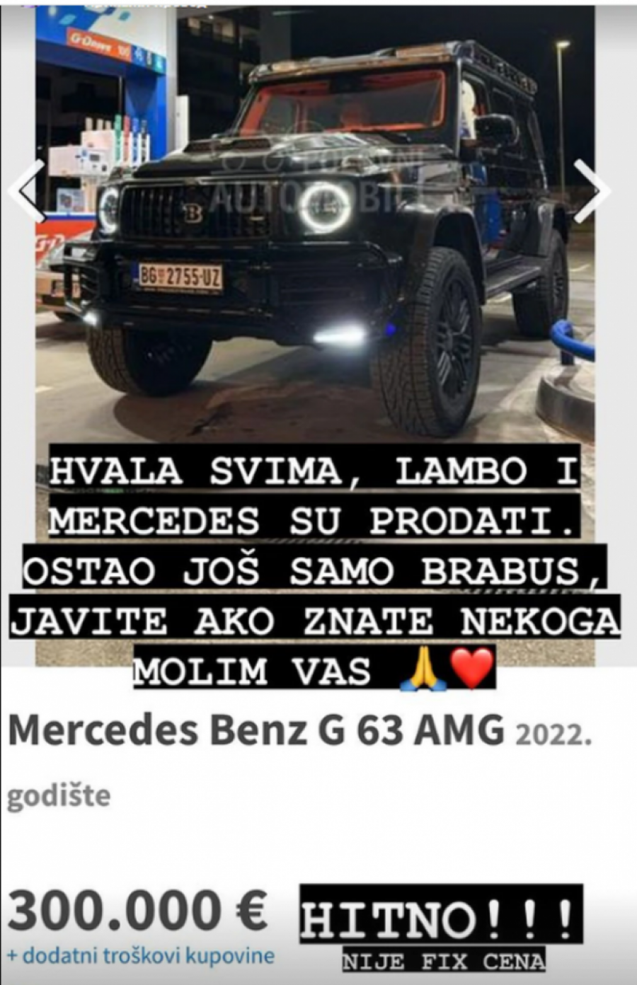 - Hvala svima, lambo i mercedes su prodati, ostao je još samo "Braus". Javite se ako znate nekoga, molim vas - napisao je on.