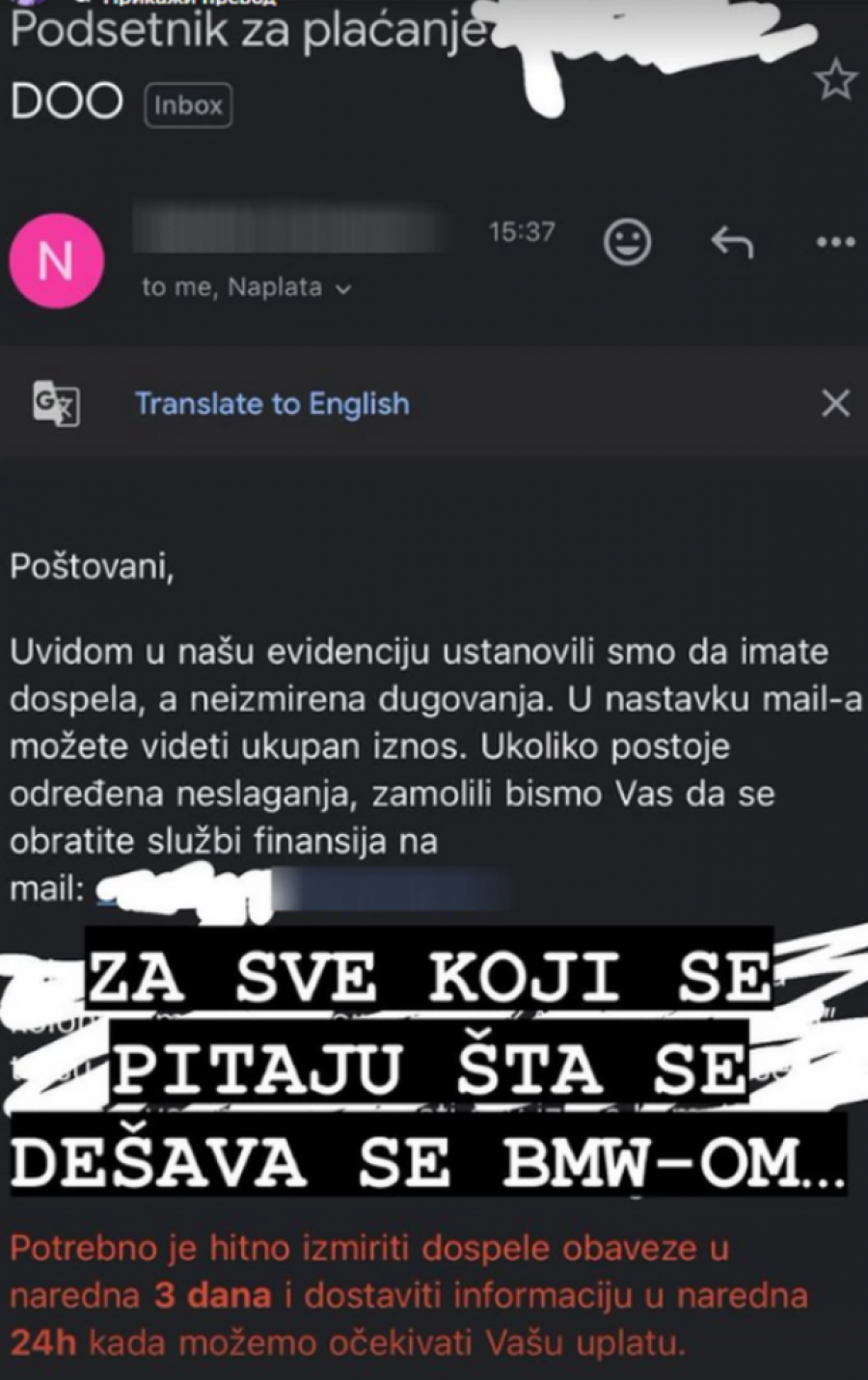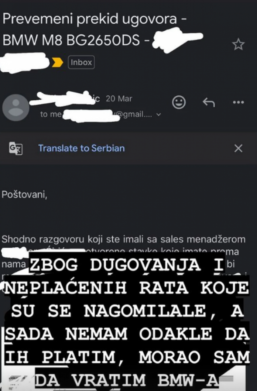- Za sve koji pitaju šta se dešava sa BMW-om. Zbog dugovanja i neplaćenih rata koje su se nagomilale, a sada nemam odakle da ih platim, morao sam da vratim BMW-a lizing kući - napisao je on.