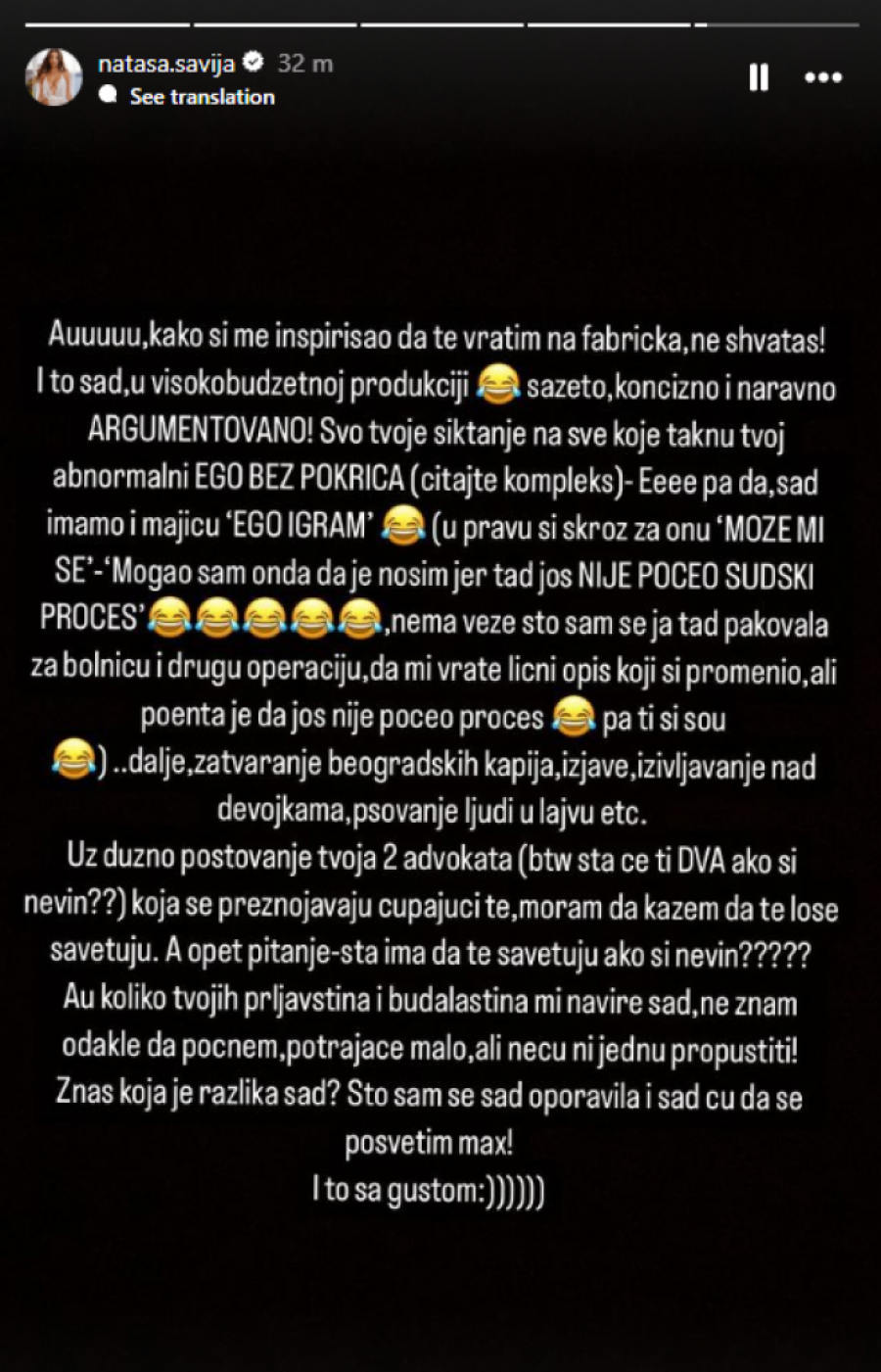 - "Mogao sam onda da je nosim, jer tad još nije počeo sudski proces", nema veze što sam se ja tad pakovala za bolnicu i drugu operaciju, da mi vrati lični opis koji si promenio, ali poenta je da još nije počeo proces, pa ti si šou! Dalje, zatvaranje beogradskih kapija, izjave, iživljavanje nad devojkama, spovanje ljudi u lajvu. Uz dužno poštovanje tvoja dva advokata, a šta će ti dva ako ti nevin? Koja se preznojavaju čupajućite, moram da kažem da te loše savetuju! A opet pitanje, šta ima da te savetuju, ako si nevin? Au, koliko tvojih prljavština i budalaština mi navire sad, ne znam odakle da počnem, potrajaće malo, ali neću nijednu propustiti! Znaš koja je razlika sad? Što sam se sad oporavila i sad ću da se posvetim maksimallno! I to sa guštom.