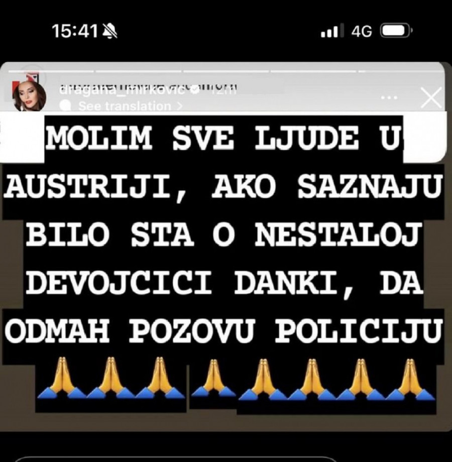 - Molim sve ljude u Austriji, ako saznaju bilo šta o nestaloj devojčici nestaloj devojčici, da odmah pozovu policiju - navela je pevačica u objavi.
