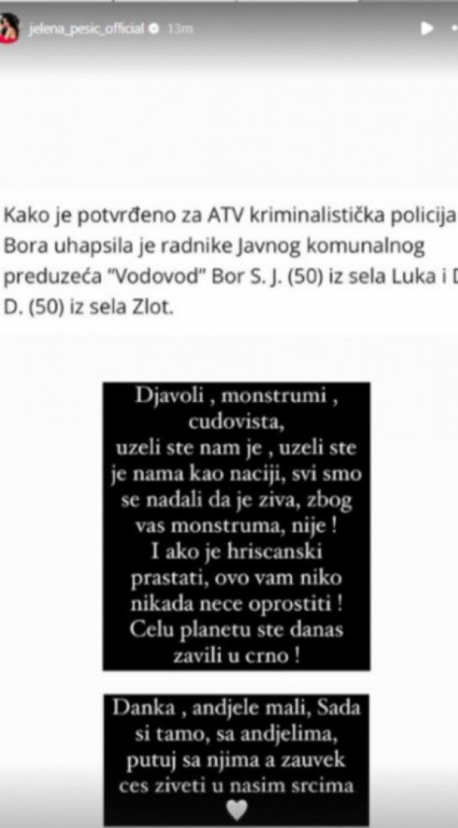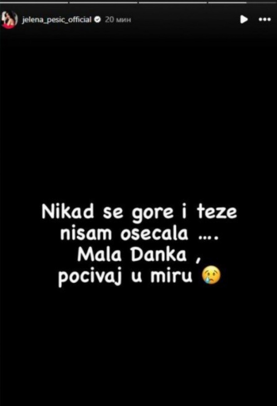 - Đavoli, monstrumi, čudovišta, uzeli ste nam je! Uzeli ste je nama kao naciji, svi smo se nadali da je živa. Zbog vas monstruma, nije! Iako je hrišćanski praštati, ovo vam niko nikada neće oprostiti! Celu planetu ste danas zavili u crno. Danka, anđele mali, sada si tamo, sa anđelima. Putuj sa njima, a zauvek ćeš živeti u našim srcima - napisala je Jelena Pešić na svom Instagram profilu.