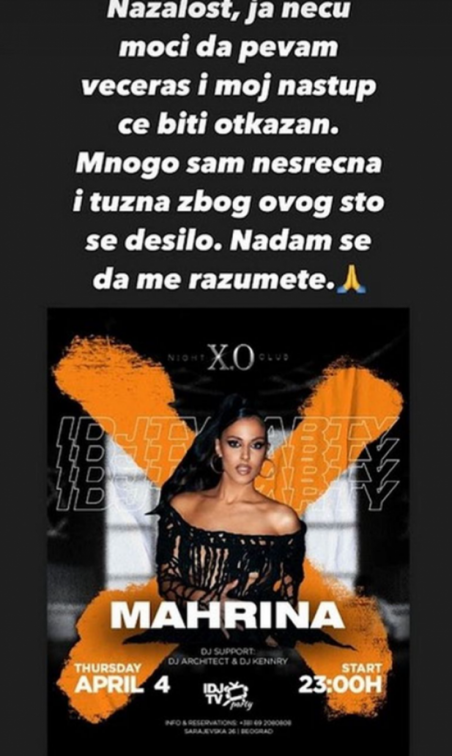 - Nažalost, ja neću moći da pevam večeras i moj nastup će biti otkazan. Mnogo sam nesrećna i tužna zbog ovoga što se desilo. Nadam se da me razumete - napisala je Mahrina.