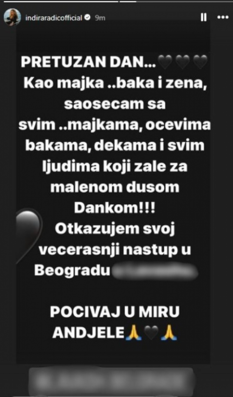- Pretužan dan... Kao majka, baka i žena, saosećam se sa svim majkama, očevima, bakama, dekama i svim Ijudima koji žale za malenom dušom Dankom!!! Otkazujem svoj večerašnji nastup u Beogradu. Počivaj u miru anđele - napisala je Indira na svom Instagram profilu.