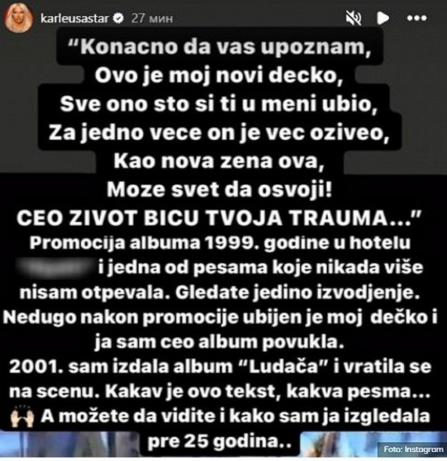 -“Konačno da vam upoznam, ovo je moj novi dečko, sve ono što si ti u meni ubio, za jedno veče on je već oživeo, kao nova žena ova, može ceo svet da osvoji! Ceo život biću tvoja trauma…” Promocija albuma 1999. godine u hotelu i jedna od pesama koje nikada više nisam otpevala. Gledate jedino izvođenje. Nedugo nakon promocije ubijen je moj dečko i ja sam ceo album povukla. 2001. sam izdala album “Ludača” i vratila se na scenu. Kakav je ovo teksta, kakva pesma… A možete da vidite i kako sam izgledala pre 25 godina… - napisala je Jelena i prvi put javno otkrila pojedine detalje iz života.