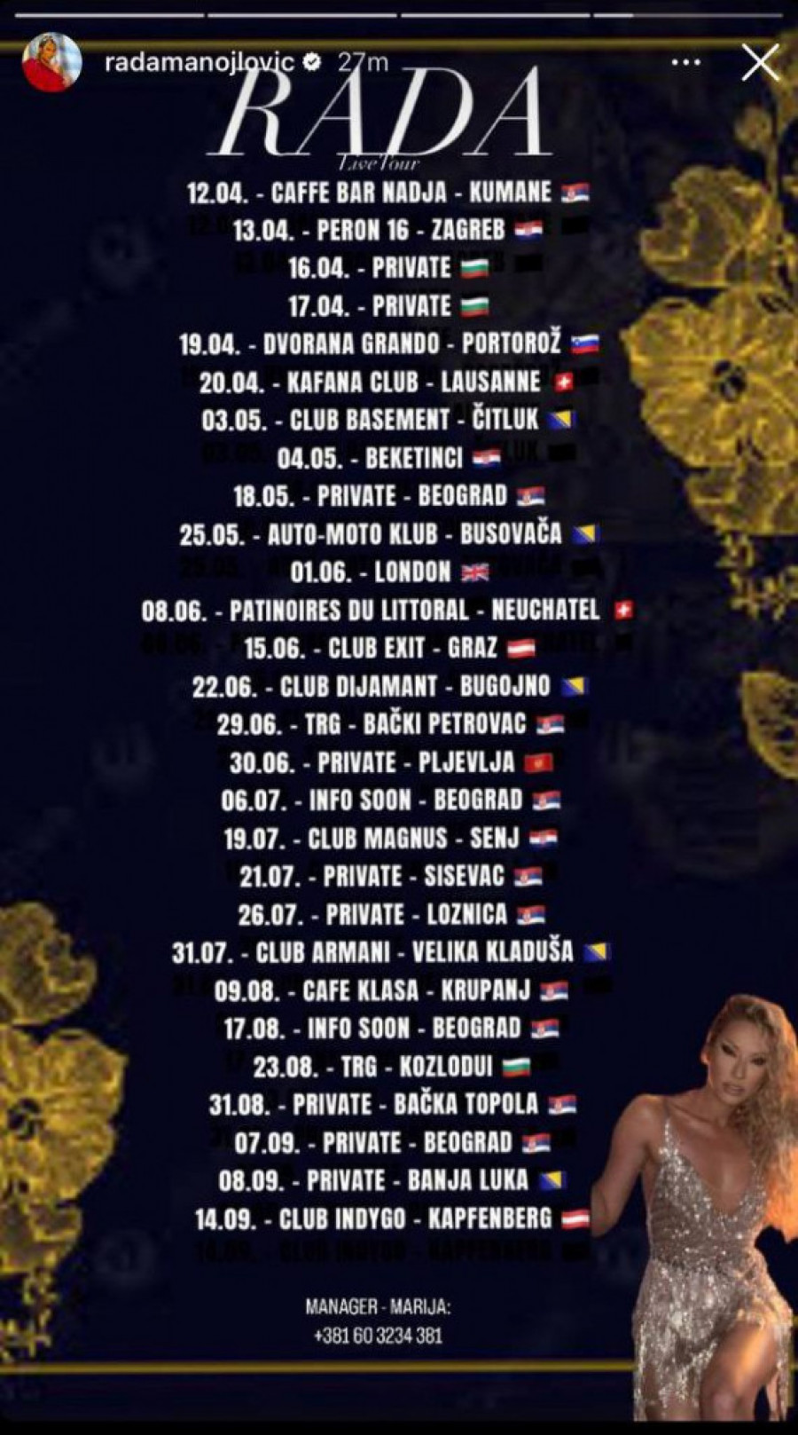 Pevačica Rada Manojlović objavila je spisak nastupa i datume sa mestima gde će publika u narednom periodu moći da ih sluša, a kako smo saznali, u džep na kraju stavlja preko 200.000 evra! Naime, pevačica za nastup u proseku traži od šest do osam hiljada evra, tako da će u narednim mesecima zaraditi dovoljno da sebi kupi pristojan stan u prestonici, ali je poznato da Radi to nije prioritet.