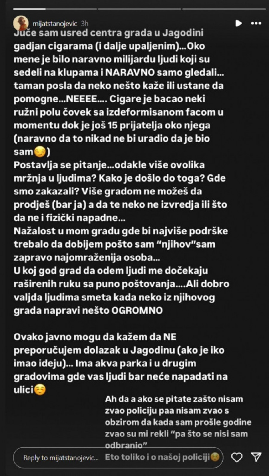 - Juče sam usred centra grada u Jagodini gađan cigaretama (i dalje upaljenim)… Oko mene je bilo, naravno, milijardu ljudi koji su sedeli na klupama i NARAVNO samo gledali… Taman posla da neko nešto kaže ili ustane da pomogne… NEEEE… Cigarete je bacio neki ružni polučovek sa izdeformisanom facom u momentu dok je još 15 prijatelja oko njega (naravno da to nikad ne bi uradio da je bio sam) - započeo je on na svom storiju i dodao: