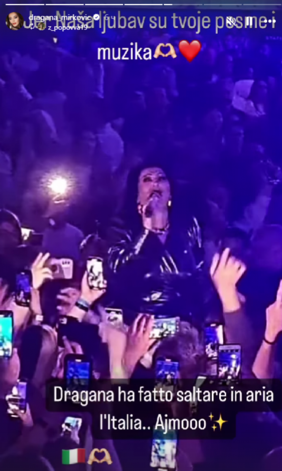 Naime, ona je podelila snimak sa koncerta u Italiji, gde je, malo je reći, izdominirala. Kako je i sama rekla, Italija je sinoć gorela, a publika je primetila da je Dragana emotivnija nego ikada, pa su mnogi to povezali upravo sa dešavanjima iz privatnog života, odnosno razvoda.