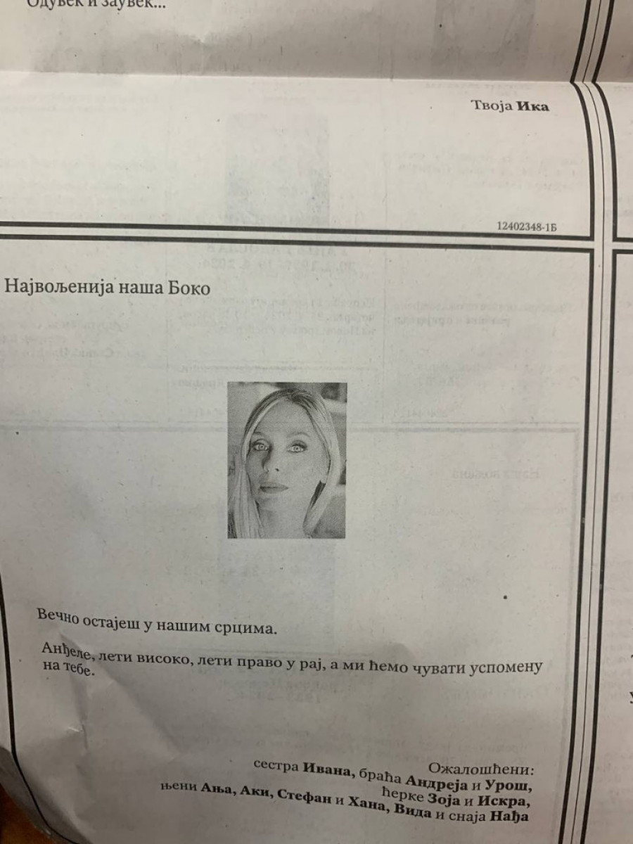 "Mojoj najveselijoj i najlepšoj sestri poslednji pozdrav. Tvoj osmeh će uvek obasjati moje srce. Uvek ćeš biti sa mnom", tvoj brat Andreja i sestričina Vida.