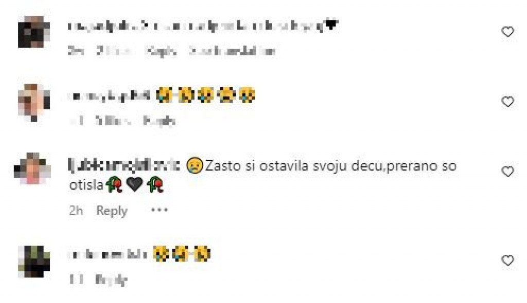 - Zašto si ostavila svoju decu, prerano si otišla - navela je jedna gospođa uz emotikone crvene ruže koja vene i crno srce, samo nekoliko sati od Bojanine sahrane.