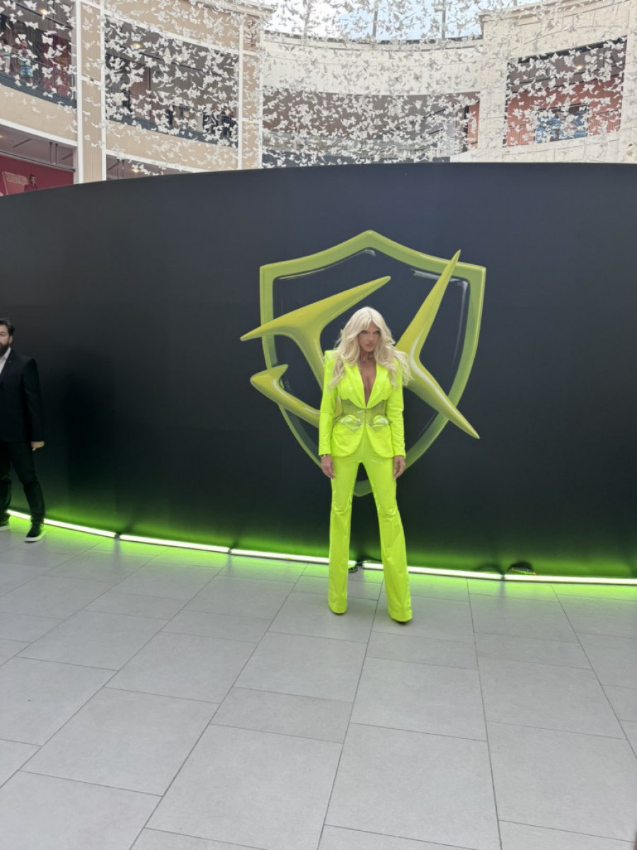 Za ovu priliku, Karleuša je odabrala prepoznatljivu odevnu kombinaciju u nijansama albuma "Alfa". Pojavila se u neon-zelenom dekoltiranom kompletu, upotpunjenom silikonskim providnim korsetom i diskretnim "Diorovim" nakitom. Njen stil i odabir garderobe su uvek predmet interesovanja i komentara javnosti, a ovoga puta nije bilo drugačije.