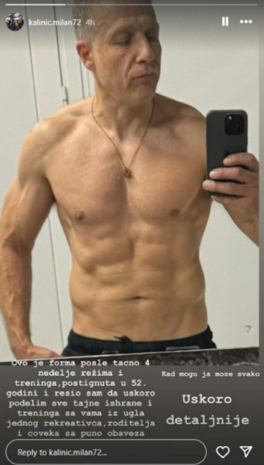 Voditelj Milan Kalinić rešio je da svoje telo dovede do savršenstva, pa je na Instagramu pokazao u kakvoj je formi. On se u ogledalu fotografisao bez majice, te je pokazao dosadašnje rezultate. Ono što je mnogima zapalo za oko jeste činjenica da je voditelj u 52. godini uspeo da dovede telo u formu mladića, pa je otkrio na koji način je sve postigao.