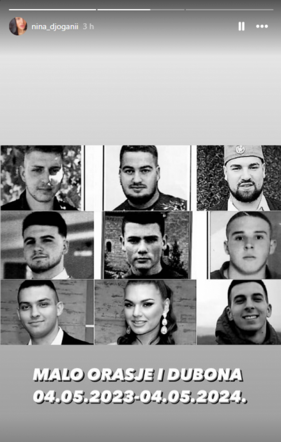 Nina Đogani, sestra popularne rijaliti zvezde Lune Đogani, danas je na svom Instagram profilu objavila fotografije tragično nastradalih prošle godine u Malom Orašju i Duboni. Ovim gestom, Nina je iskazala svoje poštovanje prema nastradalima, budući da se danas navršava tačno godinu dana od monstruoznog krvavog pira. Foto: Instagram.com