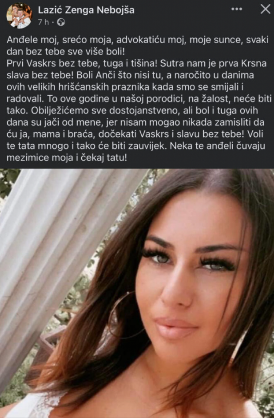 - Anđele moj, srećo moja, advokatiću moj, moje sunce, svaki dan bez tebe sve više boli! Prvi Vaskrs bez tebe, tuga i tišina! Sutra nam je prva Krsna slava bez tebe! Boli Anči što nisi tu. A naročito u danima ovih velikih hriscanških praznika kada smo se smejali i radovali. To ove godine u našoj porodici, na žalost, neće biti tako. Obeležićemo sve dostojanstveno, ali bol i tuga ovih dana su jači od mene. Jer nisam mogao nikada zamisliti da ću ja, mama i braća, dočekati Vaskrs i slavu bez tebe! Voli te tata mogo i tako će biti zauvek. Neka te anđeli čuvaju mezimice moja i čekaj tatu! -napisao je Nebojša.