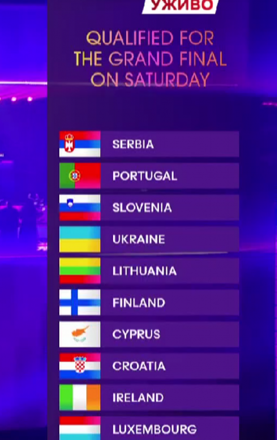 23:18 - Spisak finalista nakon prve polufinalne noći su - Srbija, Portugal, Slovenija, Ukrajna, Litvanija, Finska, Kipa, Hrvatska, Irska, Luksemburg!