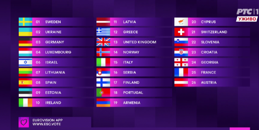 22:26 - Teya Dora nastupila je pored rednim brojem 16. Zbog njenog nastupa su svi zaplakali. Pesmom ,,Ramonda" mnogi smatraju da će Evroviziju dovesti u Srbiju sledeće godine.
