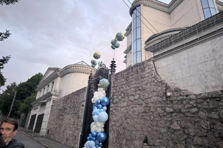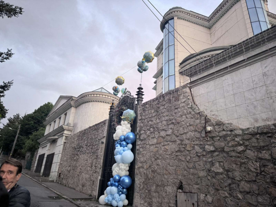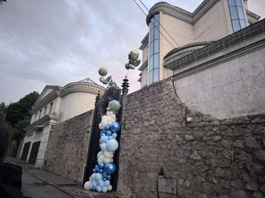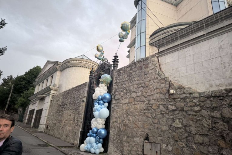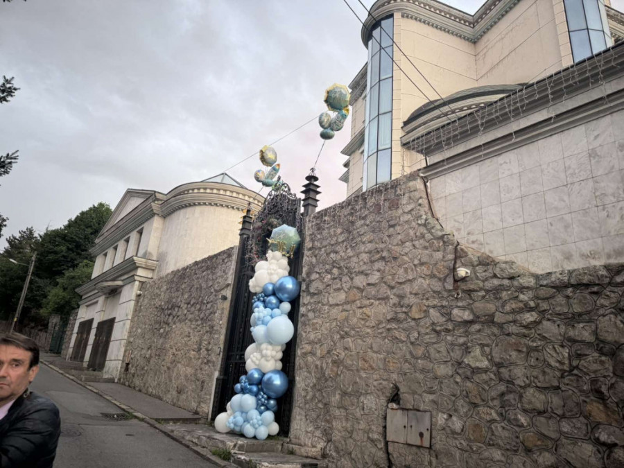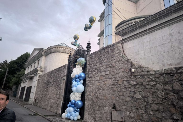 Impresivnu dekoraciju krase plavo-beli baloni i baloni sa zlatnim slovima, na kojima piše "baby". Osim toga, na vrhu kapije vile postavljeni su baloni na kojima jasno stoji ispisano: "Dečak je". Ovi detalji jasno ukazuju na radostan povod okupljanja i slave.