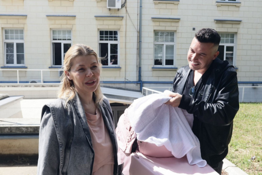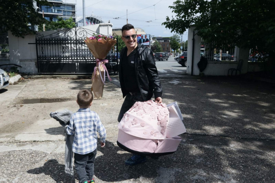 Ivan je došao po suprugu i naslednicu u porodilište, a pridružio im se i njihov petogodišnji sin Maksim. Ponosni otac je bio opremljen - nosio je roze nosiljku sa cvetnim dezenima, a Danijeli je poneo ogroman buket cveća, kao i poklon.