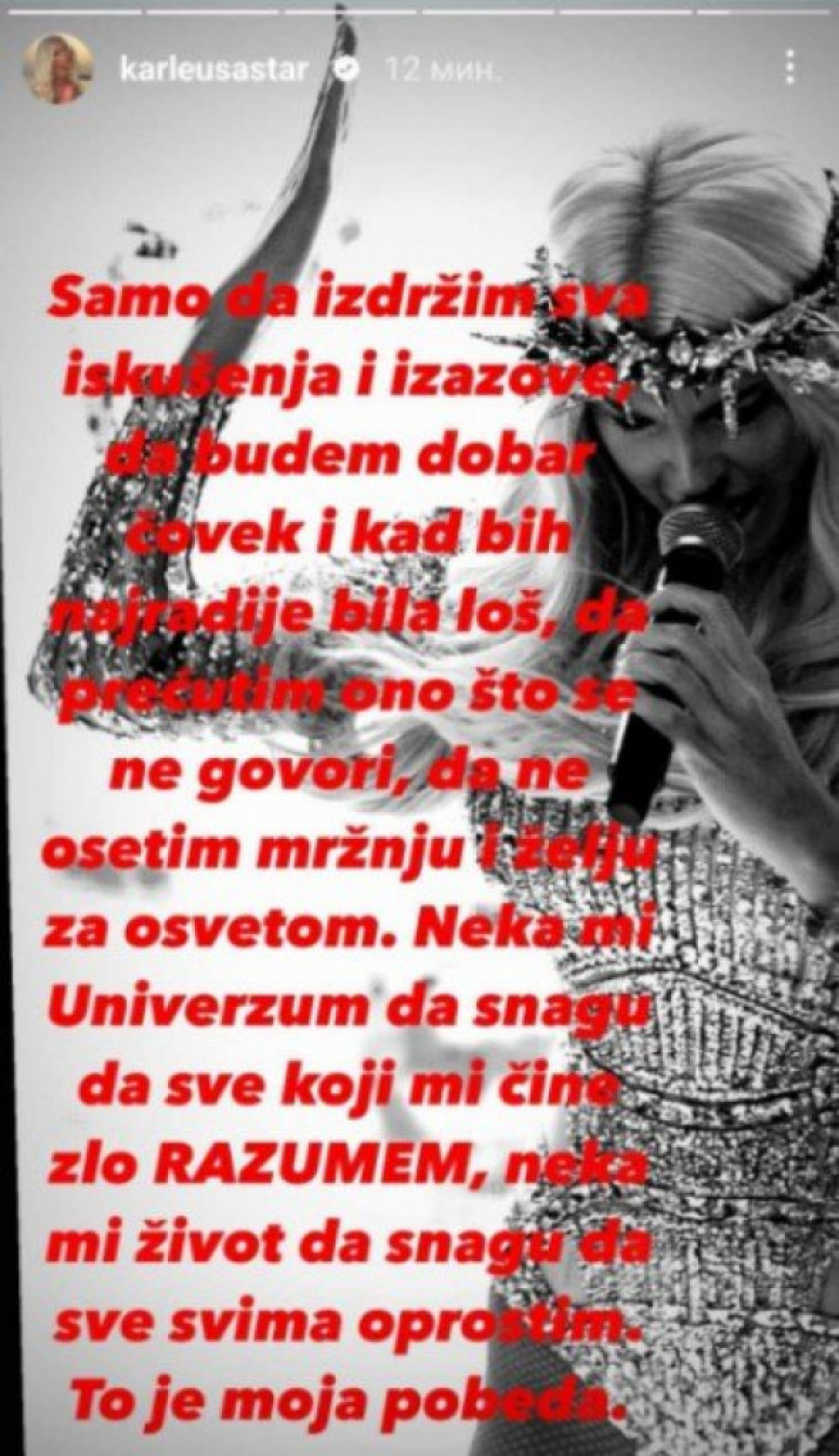 - Dok spavam sa mojom decom u sobi, "druga strana" (kamo ne naziva) piše storije sa privatne žurke. Mora da je baš luda žurka kad je juče davao "ekskluzivu". Zamolila bih "drugu stranu", mada ovde postoji samo jedna NAŠA i tužna strana, da umesto da nas bruka u medijima (zar nije bilo dovoljno bruke za tri života) konačno odgovori na predloge sporazumnog razvoda, na koji čekam pet godina. To je sve što treba da uradi, umesto da preti majci svoje dece javno, koja je za njega i zbog njega milion puta stala u odbranu - poručila je Karleuša.