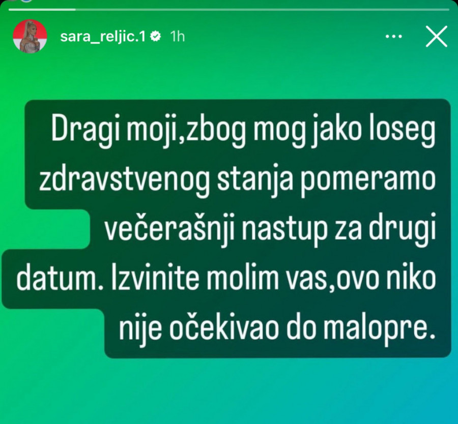 - Dragi moji, zbog moj jako lošeg zdravstvenog stanja, pomera se nastup za drugi datum. Izvinite molim vas, ovo niko nije očekivao do malopre - napisala je Sara na Instagram storiju.