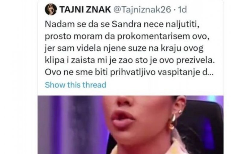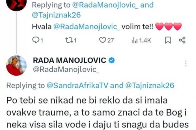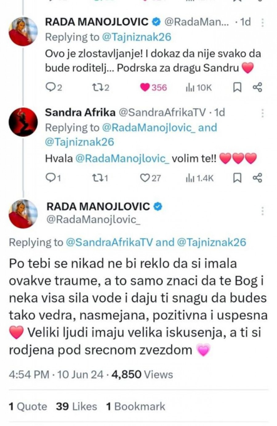 - Ovo je zlostavljanje! I dokaz da nije svako da bude roditelj… Podrška za dragu Sandru. Po tebi se nikad ne bi reklo da si imala ovakve traume, a to samo znači da te Bog i neka viša sila vode i daju ti snagu da budeš tako vedra, nasmejana, pozitivna i uspešna. Veliki ljudi imaju velika iskušenja, a ti si rođena pod srećnom zvezdom - glasio je Radin komentar.