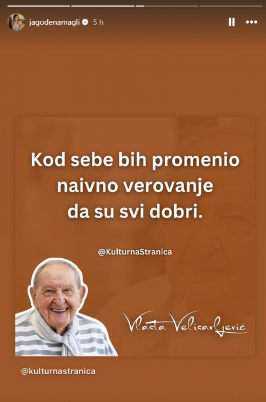 Glumica Jelisaveta Orašanin izazvala je burne reakcije među svojim pratiocima na društvenoj mreži Instagram nakon što je objavila citat svog starijeg kolege, Vlade Veličkovića. U statusu koji je podelila, Jelisaveta je citirala rečenicu "Kod sebe bih promenio naivno verovanje da su svi dobri", izazivajući brojne spekulacije i komentare među svojim pratiocima. Foto: Instagram.com