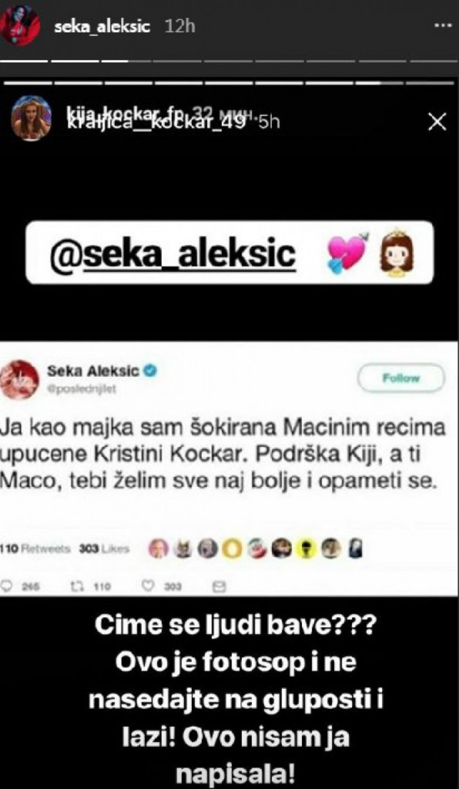 - Ja kao majka sam šokirana Macinim rečima upućenim Kiji Kockar. Podrška Kiji, a tebi, Maco, želim sve najbolje i opameti se! - piše u objavi na tviteru, a Seka je odmah reagovala na ovu objavu.