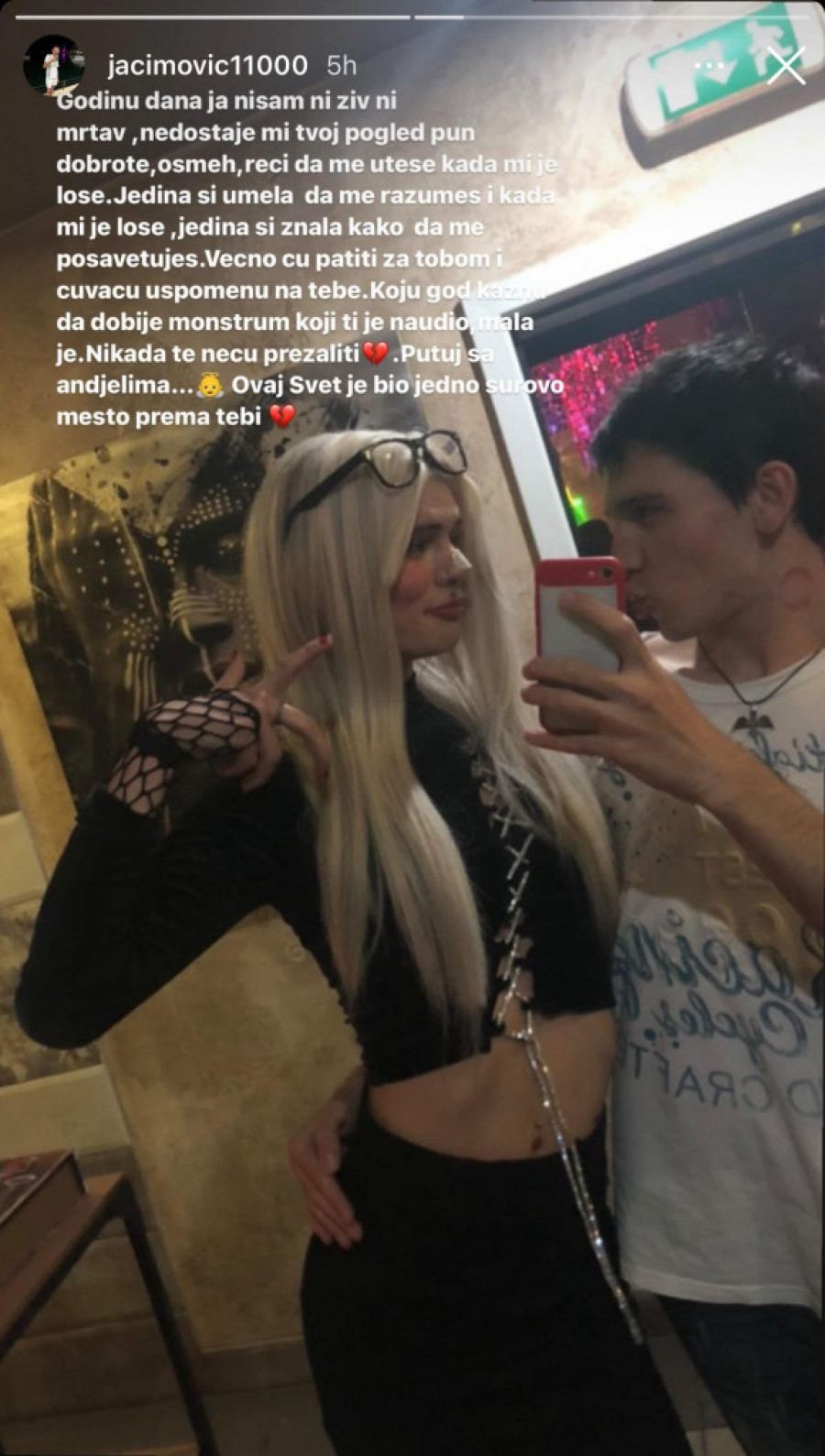 - Godinu dana ja nisam ni živ, ni mrtav, nedostaje mi tvoj pogled pun dobrote, osmeh, reči da me uteše kada mi je loše... Jedina si umela da me razumeš i kada mi je loše. Jedina si znala kako da me posavetuješ. Večno ću patiti za tobom i čuvaću uspomenu na tebe. Koju god kaznu da dobije monstrum koji ti je naudio, mala je! Nikada te neću prežaliti! Putuj sa anđelima, ovaj svet je bio jedno surovo mesto prema tebi - napisao je Noin drug na Instagram profilu.
