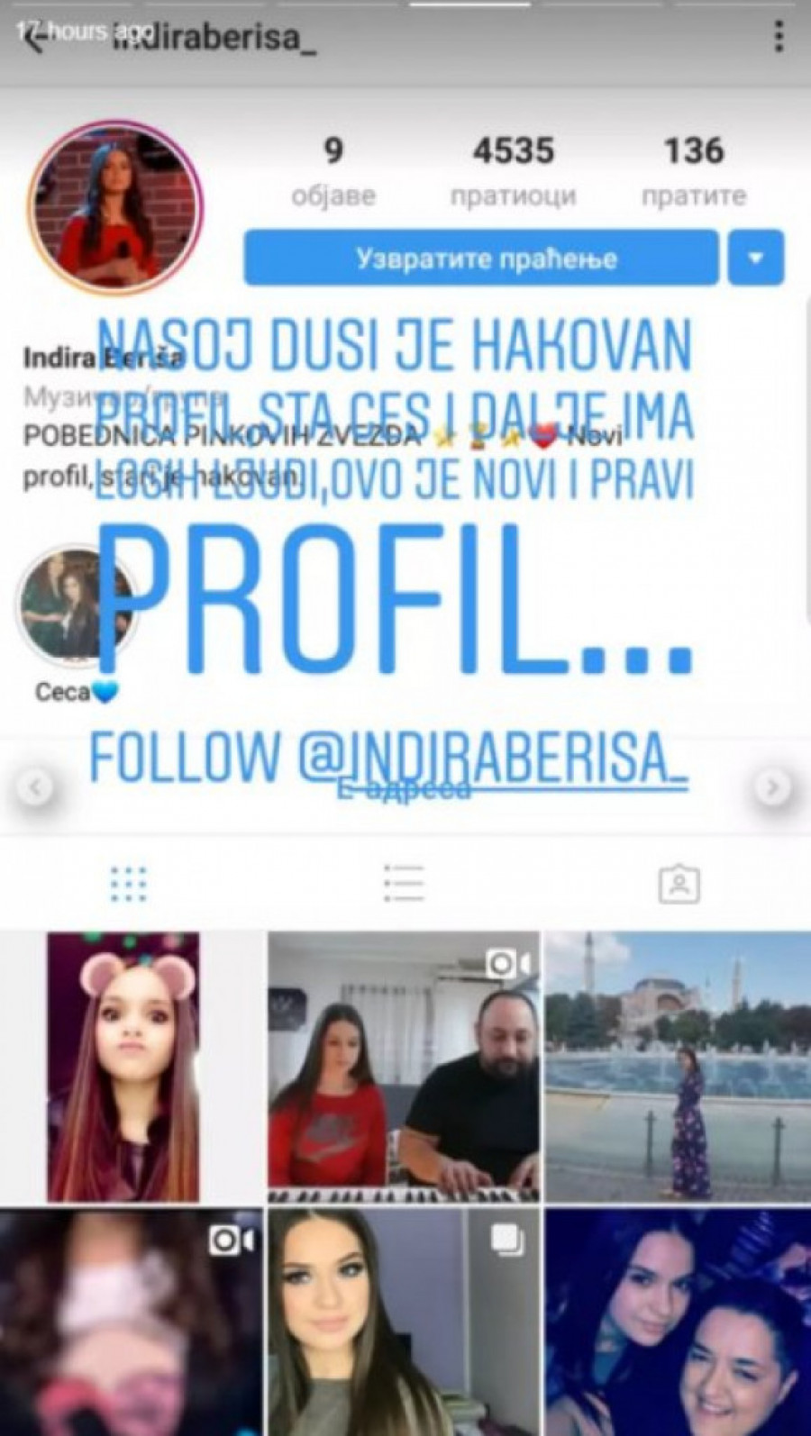 - Našoj duši je hakovan profil. Šta ćeš, i dalje ima loših ljudi. Ovo je novi i pravi profil. Zapratite @indiraberisa_ - napisala je Slađa preko storija u kom se vidi da je Indira do sada sakupila samo nekoliko hiljada pratilaca i da na novom nalogu ima tek devet fotografija.