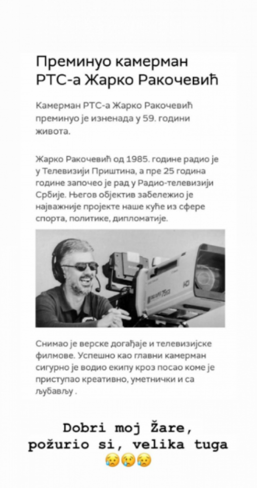 Voditeljka i autorka emisije RTS Ordinacija, Marija Popović, nedavno se javno oprostila od svog preminulog kolege, kamermana RTS-a Žarka Rakočevića. Rakočević je preminuo u 59. godini života, a Marija je izrazila svoju tugu putem emotivnih reči.