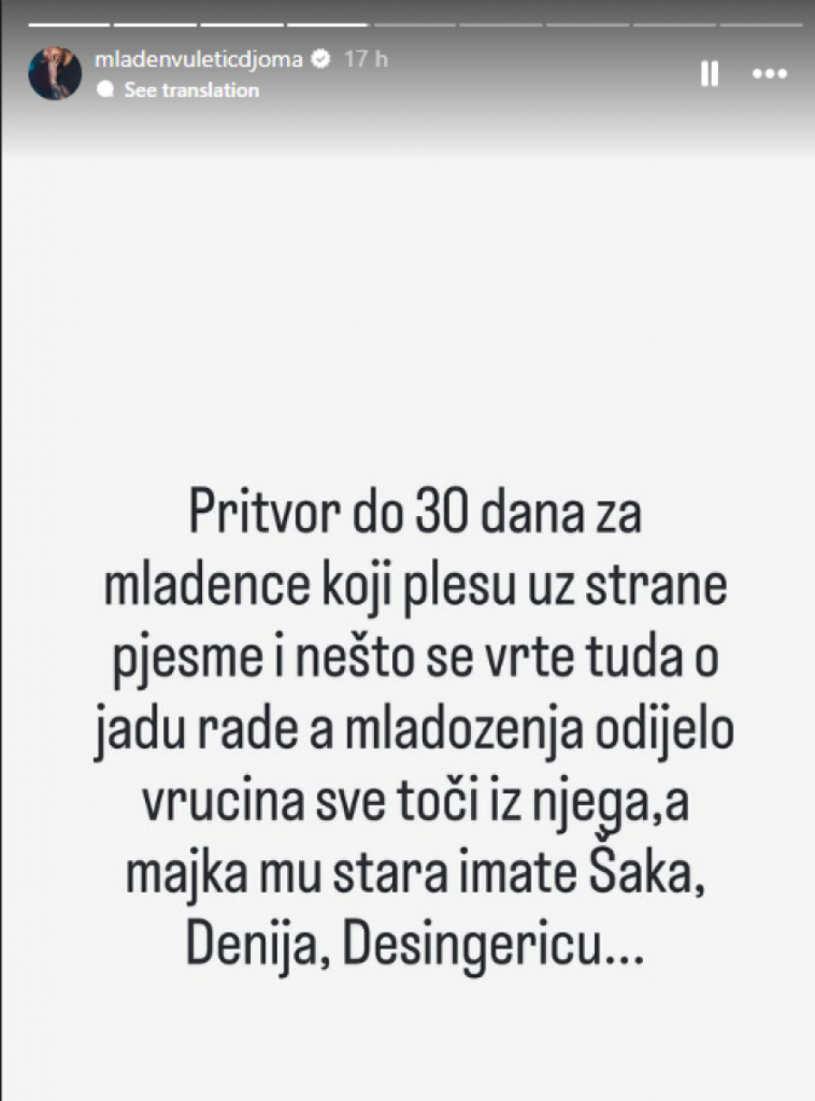 - Pritvor od 30 dana za mladence koji plešu uz strane pesme i nešto se vrte tuda o jadu rade, a mladoženja odelo vrućina sve toči iz njega, a majka mu stare, imate Šaka, Denija, Desingericu - napisao je Mladen Vuletić.