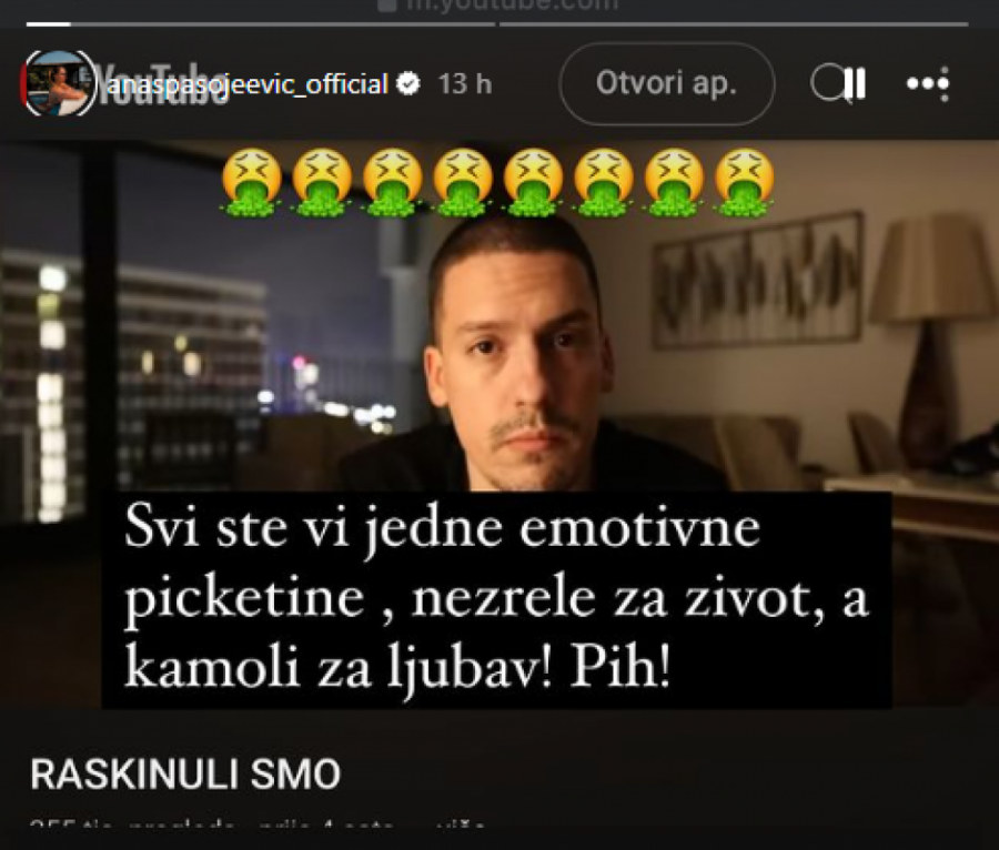 - Razlog raskida... Kad sam ušao u vezu sa Anjom, ja sam ušao u zonu komfora, svaki dodir, pogled, bilo mi je prelepo. Pored toga što mi je bila devojka, bila mi je najbolji drug. Manje sam se posvetio poslu i sebi. Nije ona kriva zbog toga. Nego ja sam se tako osećao, da ne moram ništa više da radim. To je počelo da me tišti duže vreme. Javila mi se ta želja da se vratim na statro, da se posvetim sebi i Jutjubu. Iskreno, mnogo mi je teško, jer sam toliko opušten sa njom. Ne očekujem da mnogo vas razume - istakao je Jutjuber.