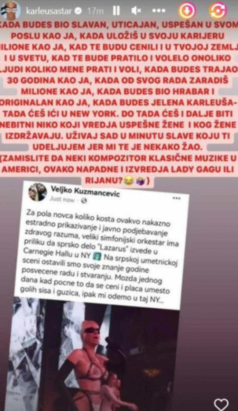 Srpski kompozitor Veljko Kuzmančević nedavno je izazvao dosta pažnje svojim komentarima na društvenim mrežama, kada je isprozivao poznatu pop divu Jelenu Karleušu. Kuzmančević je na svom Fejsbuk profilu objavio provokativnu fotografiju Karleuše sa jednog njenog nastupa, uz oštre reči upućene popularnoj pevačici. Foto: Instagram.com