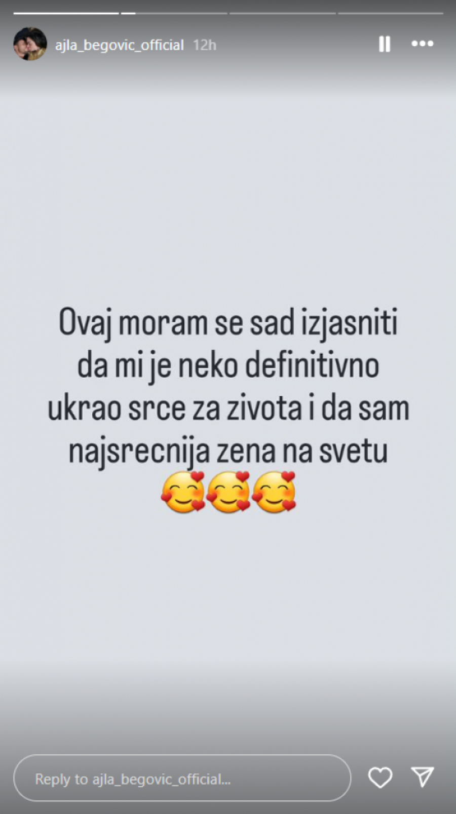 - Ovaj, moram se sad izjasniti da mi je neko definitivno ukrao srce za života i da je najsrećnija žena na svetu - napisala je Ajla.