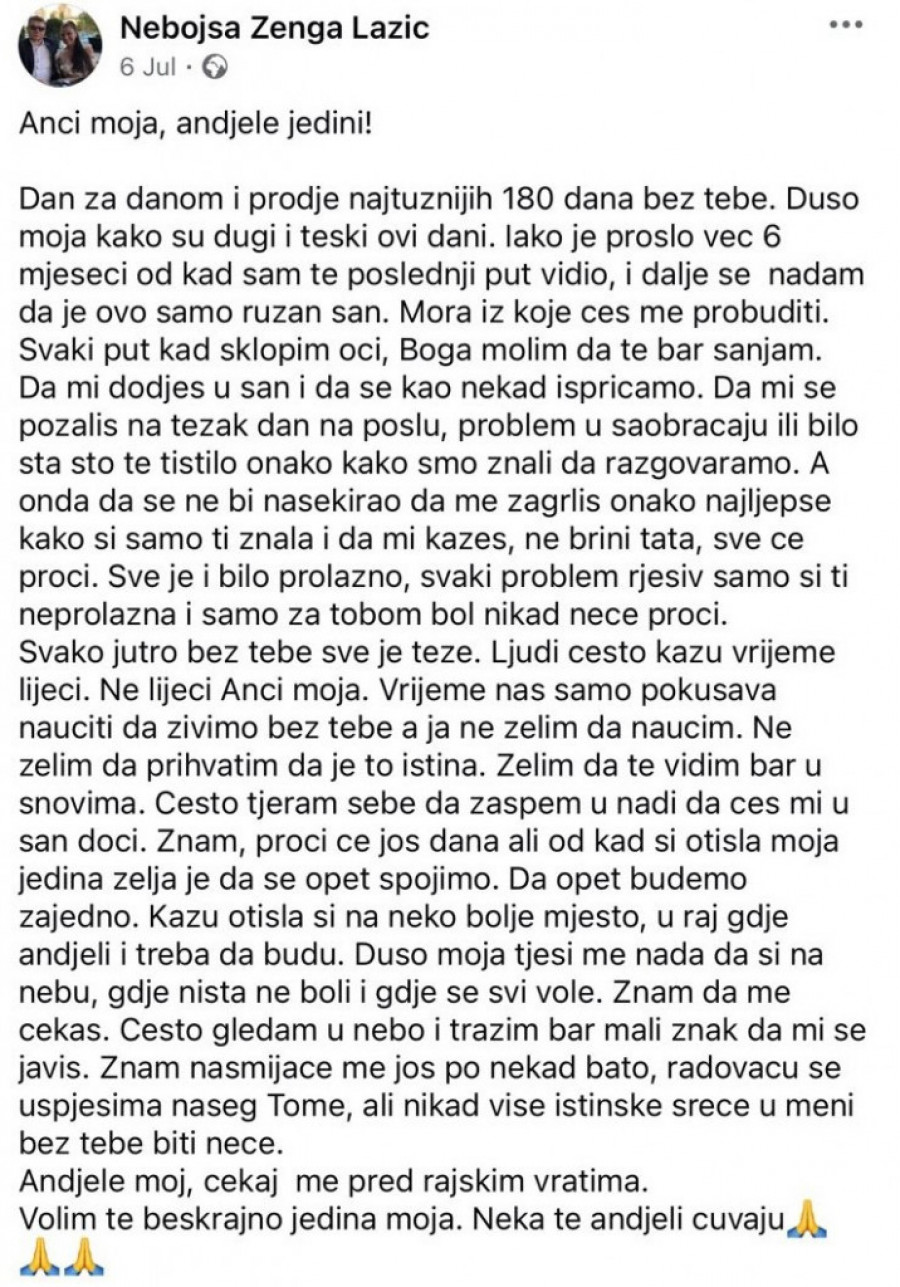 - Anči moja, anđele jedini! Dan za danom i prođe najtužnijih 180 dana bez tebe. Dušo moja kako su dugi i teški ovi dani. Iako je prošlo već 6 meseci, od kad sam te poslednji put video, i dalje se nadam da je ovo samo ružan san. Mora iz koje ćeš me probuditi. Svaki put kad sklopim oči, Boga molim da te bar sanjam. Da mi dođeš u san i da se kao nekad ispričamo. Da mi se požališ na težak dan na poslu, problem u saobraćaju ili bilo šta što te tištilo onako kako smo znali da razgovaramo. A onda da se ne bi nasekirao da me zagrliš onako najlepše kako si samo ti znala i da mi kažeš, ne brini tata, sve će proći. Sve je bilo prolazno, svaki problem rešiv, samo si ti neprolazna i samo za tobom bol nikad neće proći. Svako jutro bez tebe, sve je teže. Ljudi, često kažu vreme leči - napisao je Zenga, pa nastavio: