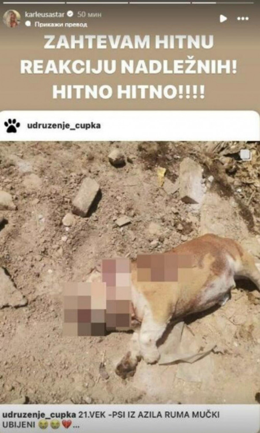 Pop zvezda Jelena Karleuša, osim po svom muzičkom talentu, poznata je i po svojoj posvećenosti zaštiti životinja. Na društvenim mrežama redovno se zalaže za njihova prava, a danas je na svom Instagram profilu objavila potresnu fotografiju psa kojeg je neko mučki ubio. U opisu objave pevačica je zahtevala hitnu reakciju nadležnih, ističući važnost zaštite životinja.