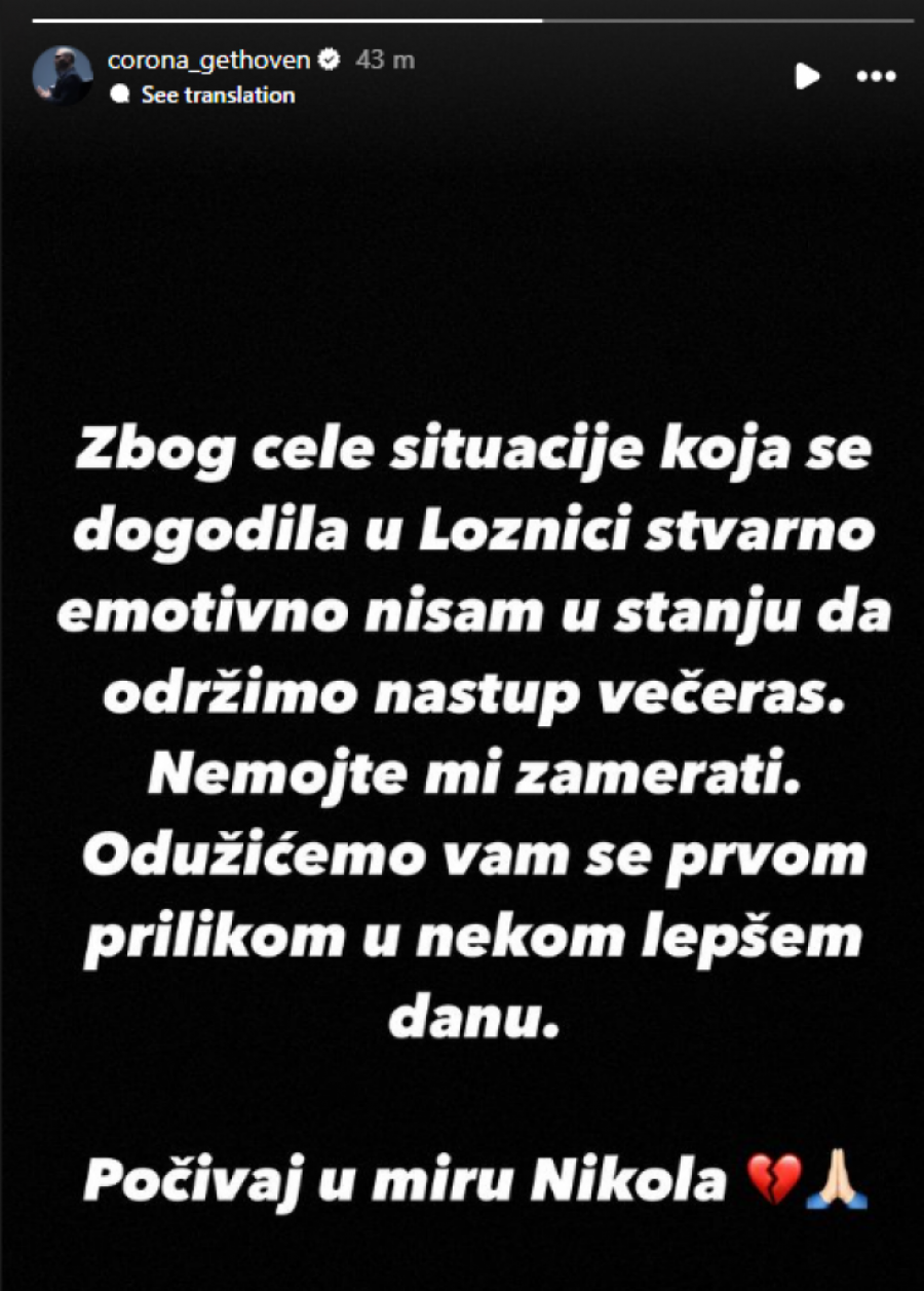 - Zbog cele situacije koja se dogodila u loznici, stvarno emotivno nisam u stanju da održimo nastup večeras. Nemojte mi zamerati! Odužićemo vam se prvom prilikom u nekom lepšem danu. Počivaju u miru, Nikola - napisao je Korona na Instagramu.