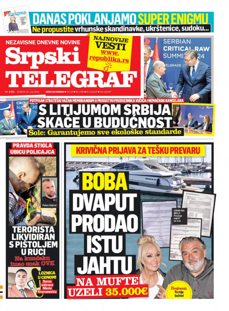 BOBI PRETI ROBIJA: Dvaput prodao istu jahtu! ČITAJTE U SRPSKOM TELEGRAFU! Danas poklanjamo super enigmu