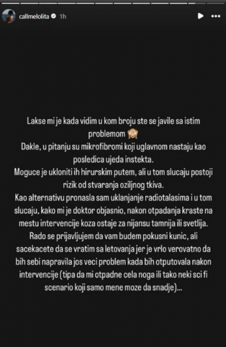 Jovana je objasnila da je reč o mikrofibromima koji uglavnom nastaju kao posledica ujeda insekata. Ovaj zdravstveni problem može se ukloniti hirurškim putem, ali postoji rizik od stvaranja ožiljnog tkiva. Kao alternativu, Jovana je istražila uklanjanje radiotalasima, pri čemu je navela da bi nakon ovakve intervencije koža mogla ostati za nijansu tamnija ili svetlija.