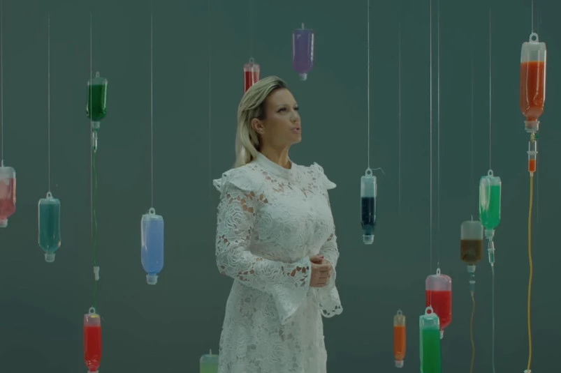 Naime, Kokićeva se našla u kavezu koji je prekriven ekranima, a u jednom trenutku vidimo da je priključena na više različitih infuzija. Tako na bočicama u različitim bojama piše: ljubav, želja, zadovoljstvo, elan...