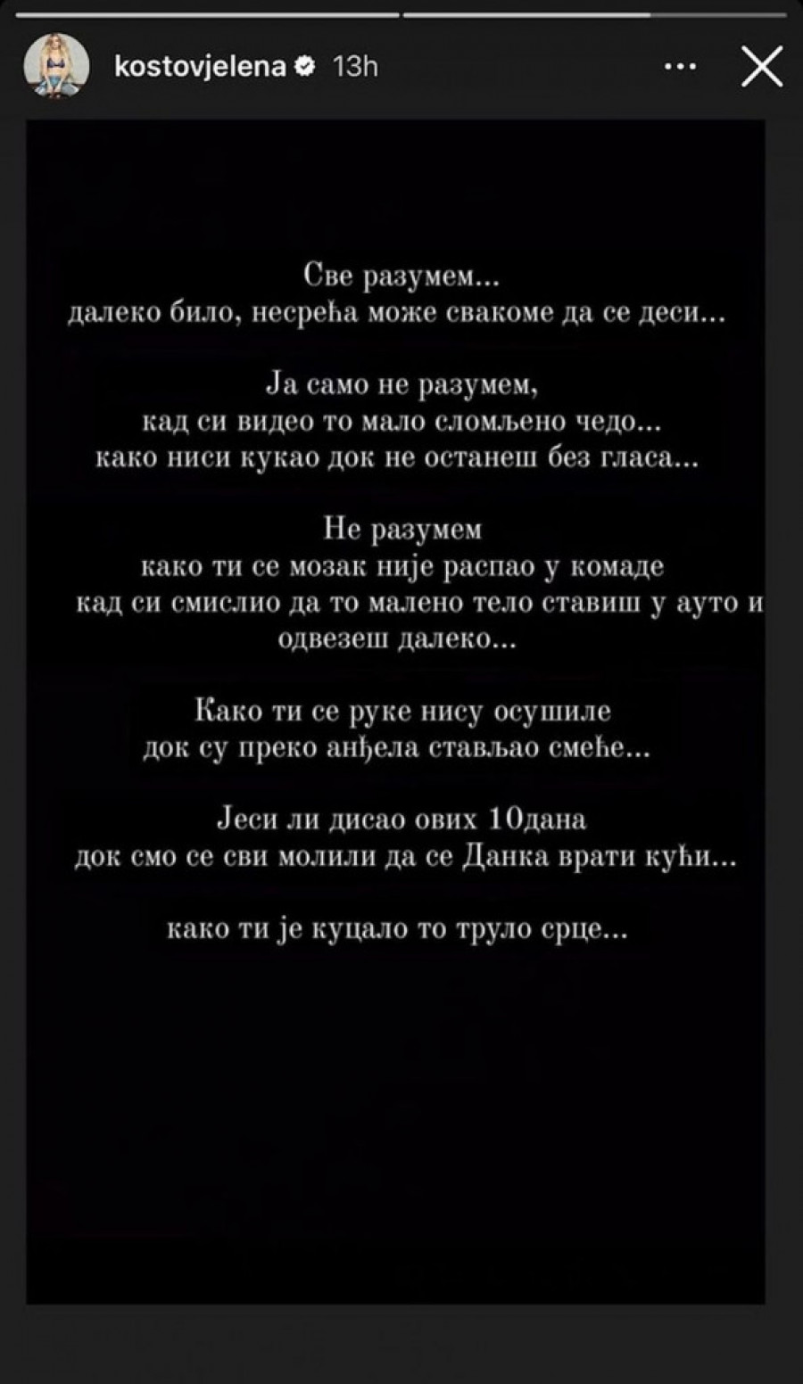 - Sve razumem... Daleko bilo, nesreća može svakome da se desi... Ja samo ne razumem, kad si video to malo slomljeno čedo... kako nisi kukao dok ne ostaneš bez glasa... Ne razumem, kako ti se mozak nije raspao u komade kad si smislio da to maleno telo staviš u auto i odvezeš daleko... Kako ti se ruke nisu osušile dok si preko anđela stavljao smeće... Jesi li disao ovih 10 dana? Dok smo se svi molili da se nestala devojčica vrati kući... Kako ti je kucalo to trulo srce... - napisala je Jelena tada na Instagramu.