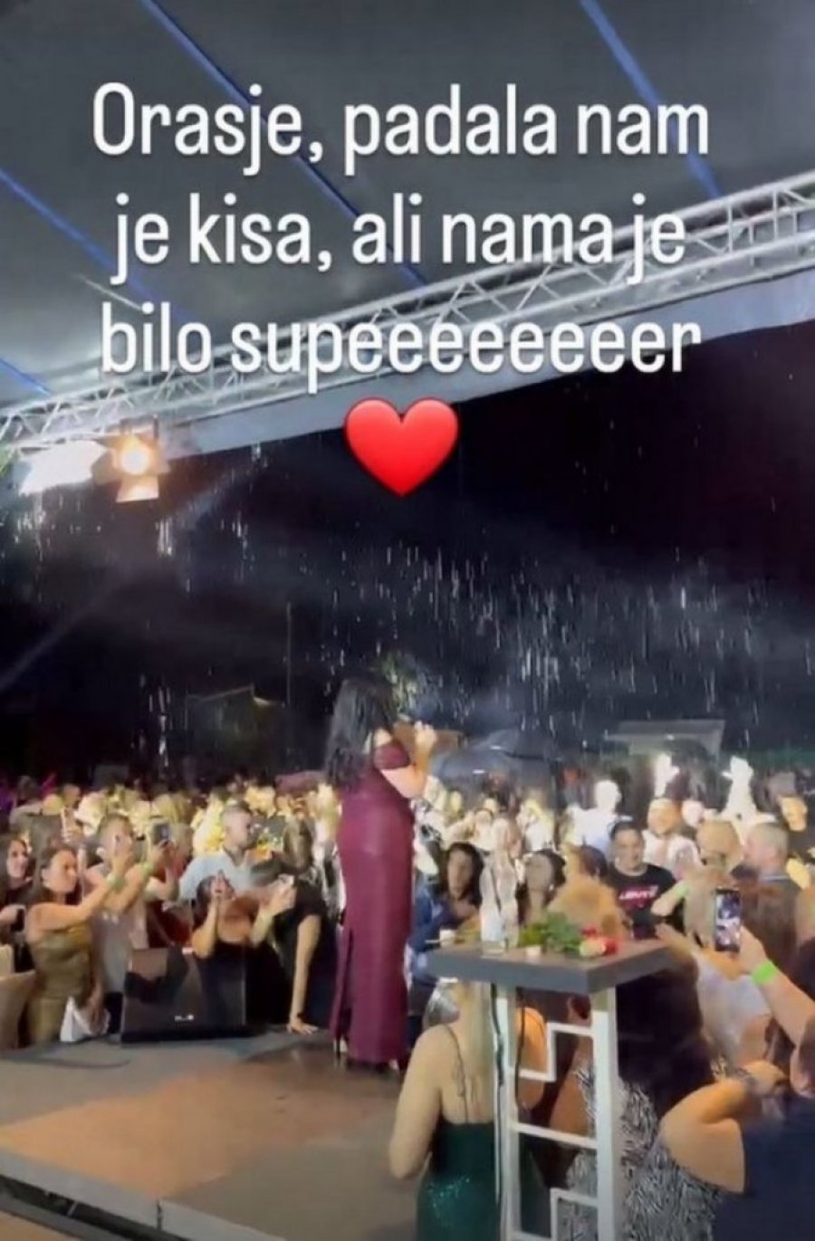 „Orašje padala nam je kiša, ali nama je bilo super“, rekla je Dragana, osmehujući se svojoj vernoj publici. Njen humor i pozitivna energija dodatno su razgalili prisutne. „Pa siđem i ja da kisnemo zajedno“, dodala je, pokazujući svoje iskreno uživanje u trenutku koji će zauvek ostati deo uspomene svih prisutnih.
