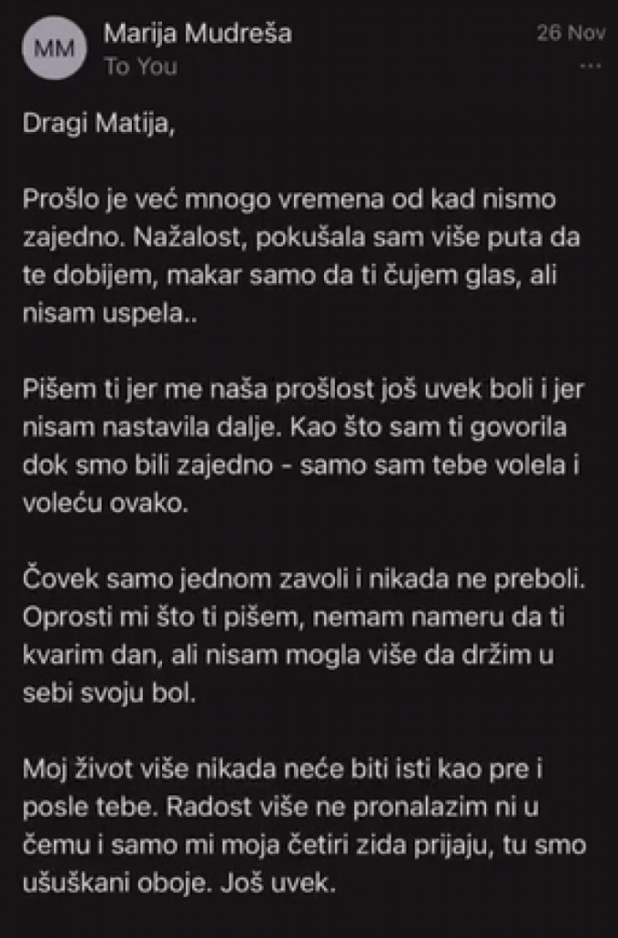 - Dragi Matija, prošlo je već mnogo vremena od kad nismo zajedno. Nažalost, pokušala sam više puta da te dobijem, makar samo da ti čujem glas, ali nisam uspela. Pišem ti jer me naša prošlost još uvek boli i jer nisam nastavila dalje. Kao što sam ti govorila dok smo bili zajedno, samo sam tebe volela i voleću ovako. Čovek samo jednom zavoli i nikada ne preboli. Oprosti mi što ti pišem, nemam nameru da ti kvarim dan, ali nisam mogla više da držim u sebi svoju bol. Moj život više nikada neće biti isti kao pre i posle tebe. Radost više ne pronalazim ni u čemu i samo mi moja četiri zida prijaju, tu smo ušuškani oboje. Još uvek - stoji u mejlu koji je Marija poslala Matiju, kog je optužila za navodno nasilje, a zatim nastavila u istoj poruci: