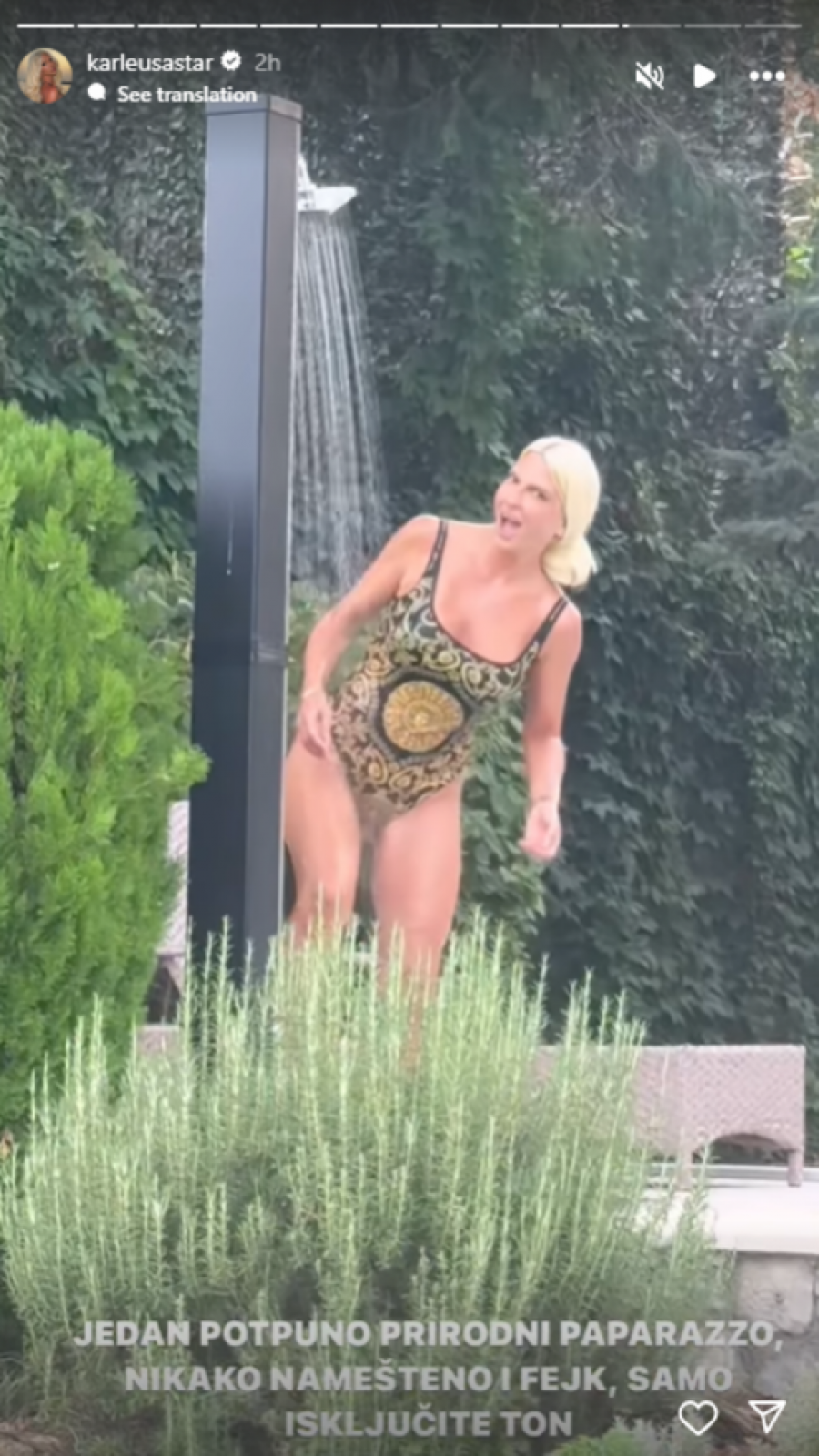 Jelena Karleuša je ponovo izazvala veliku pažnju na društvenim mrežama objavom "paparaco" snimka na kojem se tušira u dvorištu, dok ju je prijatelj "tajno" snimao. U jednodelnom kupaćem kostimu, Karleuša je pokazala svoje zanosno telo, što je izazvalo oduševljenje kod brojnih pratilaca. Pevačica je naglasila da je snimak potpuno prirodan, nikako namešten i fejk, što je dodatno privuklo pažnju javnosti.