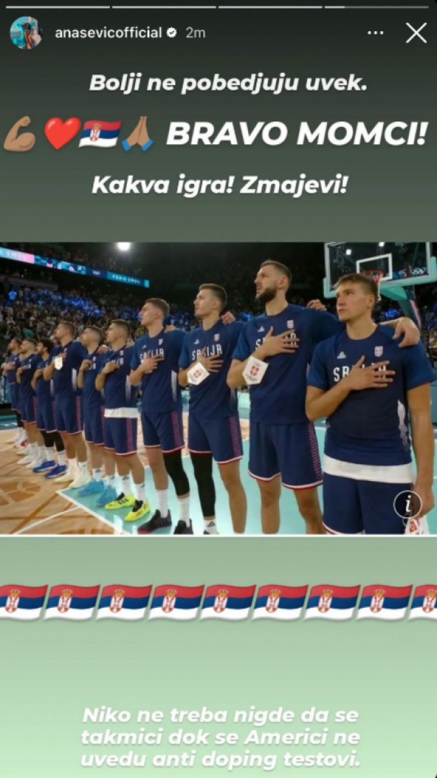 - Momci, bravo! Ovako se bori za svoju zemlju! Ponosni smo na vas! Ćekamo bronzu! Idemo dalje - napisala je Pavlovićeva, dok je njen primer sledila i glumica Anđelka Prpić je u svom komentaru opisala našu reprezentaciju kao prave "šmekere":