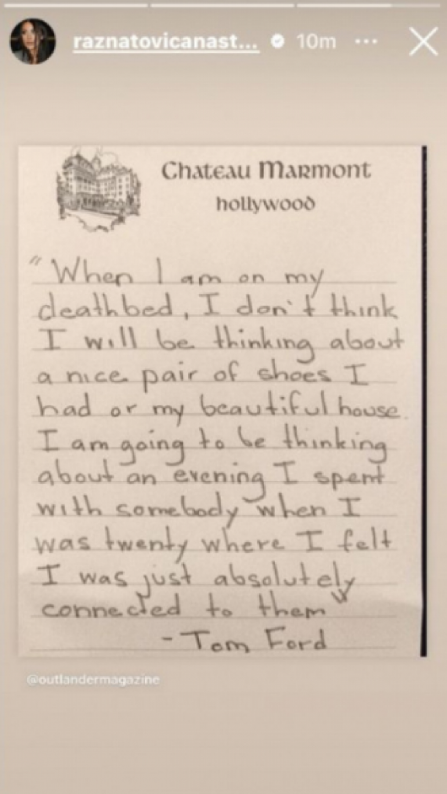 Nedavno je Anastasija na svojim društvenim mrežama podelila dirljivo priznanje koje je izazvalo pažnju javnosti. Citat Toma Forda koji je objavila na Instagramu otkriva njen introspektivni pristup životu i ističe važnost emotivnih trenutaka i povezanosti sa drugim ljudima.