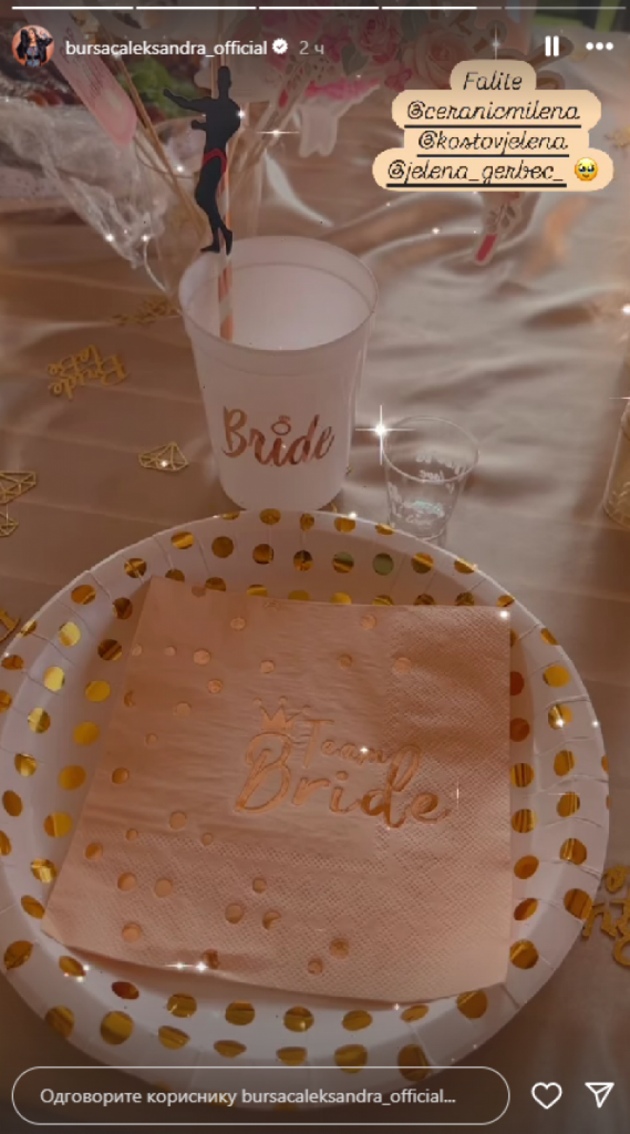 Na devojačkom večeru, devojke su nosile posebne narukvice, pevale i igrale, a na salvetama je bilo ispisano "Tim mlada". Atmosfera je bila vesela, a fotografije sa lude žurke oduševile su pratioce na društvenim mrežama. Bursać je uživala sa svojim prijateljicama, a nije izostalo ni po koji gutljaj pića.