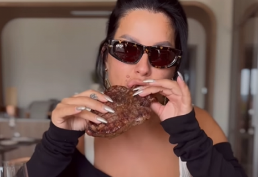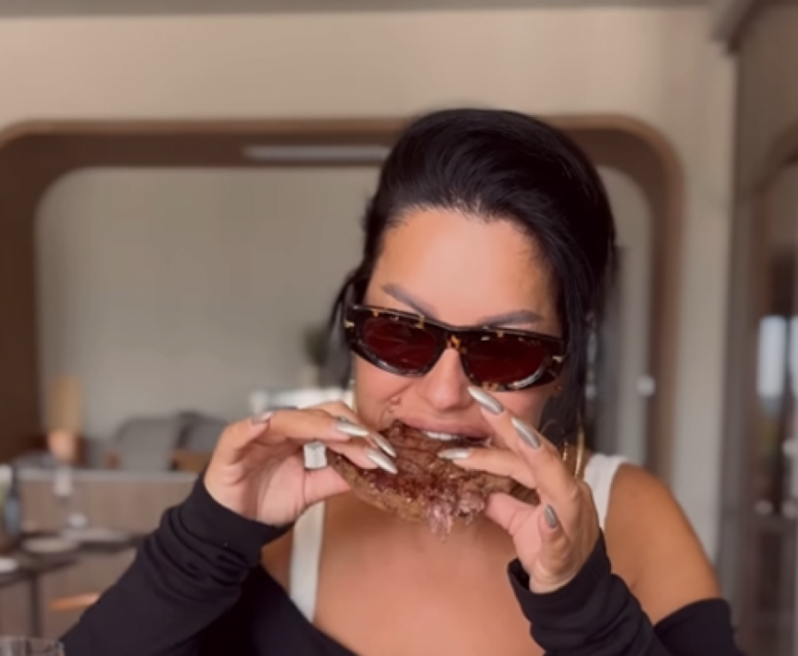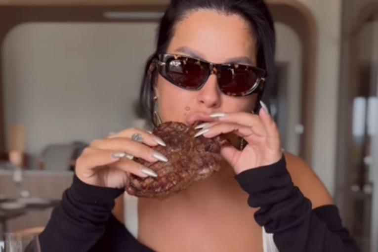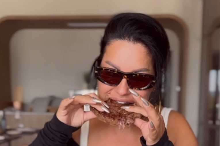 U svom, sada već poznatom, opuštenom fazonu, pevačica se malo našalila sa svojim suprugom dok su ručali u restoranu. Naime, na pomenutom snimku se može videti kako pevačica doterana "do bola" elegantno uzima slanik i u stilu velikog kuvara bogato soli svoj odrezak serviran sa rukolom i gotovo umetninom iscrtanom balzamiko sosom, a potom uzima šniclu i počinje da je kida zubima direktno iz ruku, mrzovoljno gledajući u escajg.