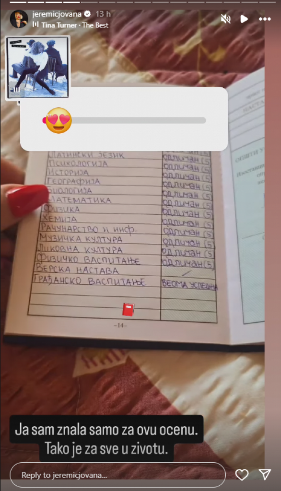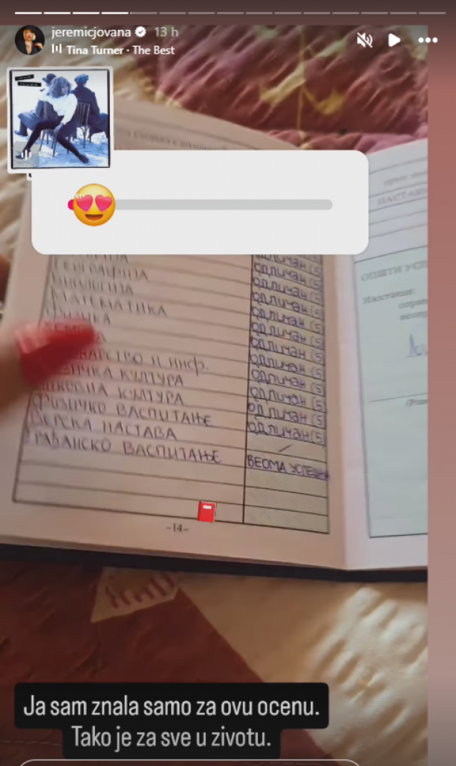 Na svom Instagram profilu, voditeljka Jovana Jeremić je nedavno objavila fotografiju svoje đačke knjižice, potvrdivši tako javnosti da je bila đak generacije. Ovo je posebno zanimljivo jer je poznato da joj je ta titula nepravedno oduzeta od strane škole koju je pohađala u Ljigu, o čemu je Jovana ranije govorila.