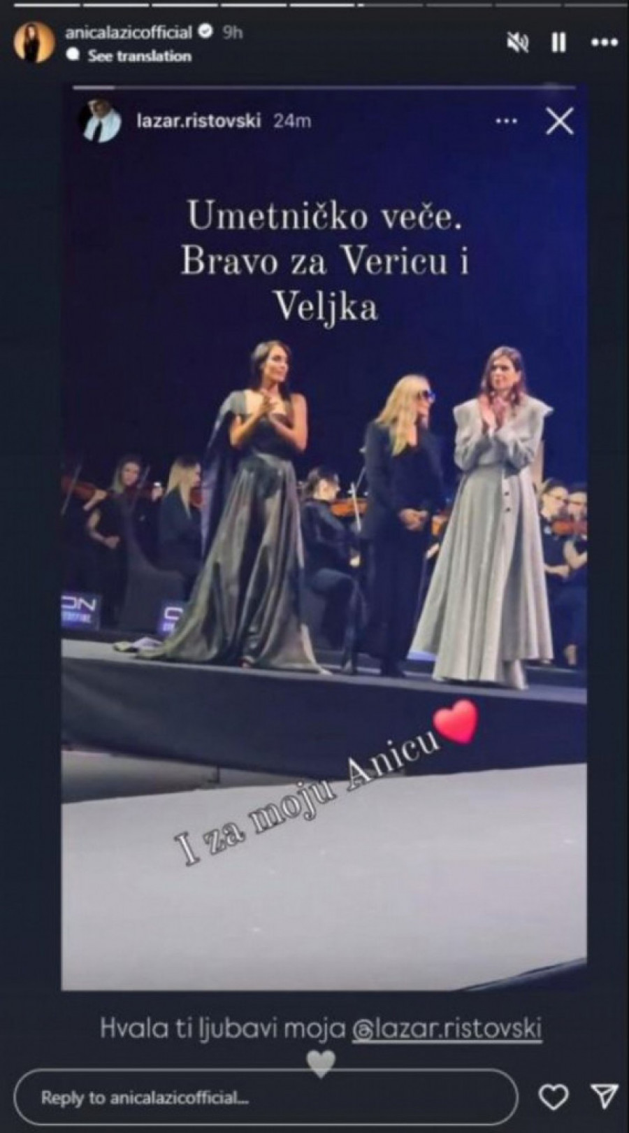 Naime, na svom Instagram nalogu, Ristovski je iskazao svoje oduševljenje svojom 39 godina mlađom izabranicom, objavljujući zajedničku fotografiju sa revije. Uz srdačnu poruku podrške Verici Rakočević i njenom partneru Veljku, a zatim se javno obratio Lazićevoj, na šta je ona odmah reagovala.