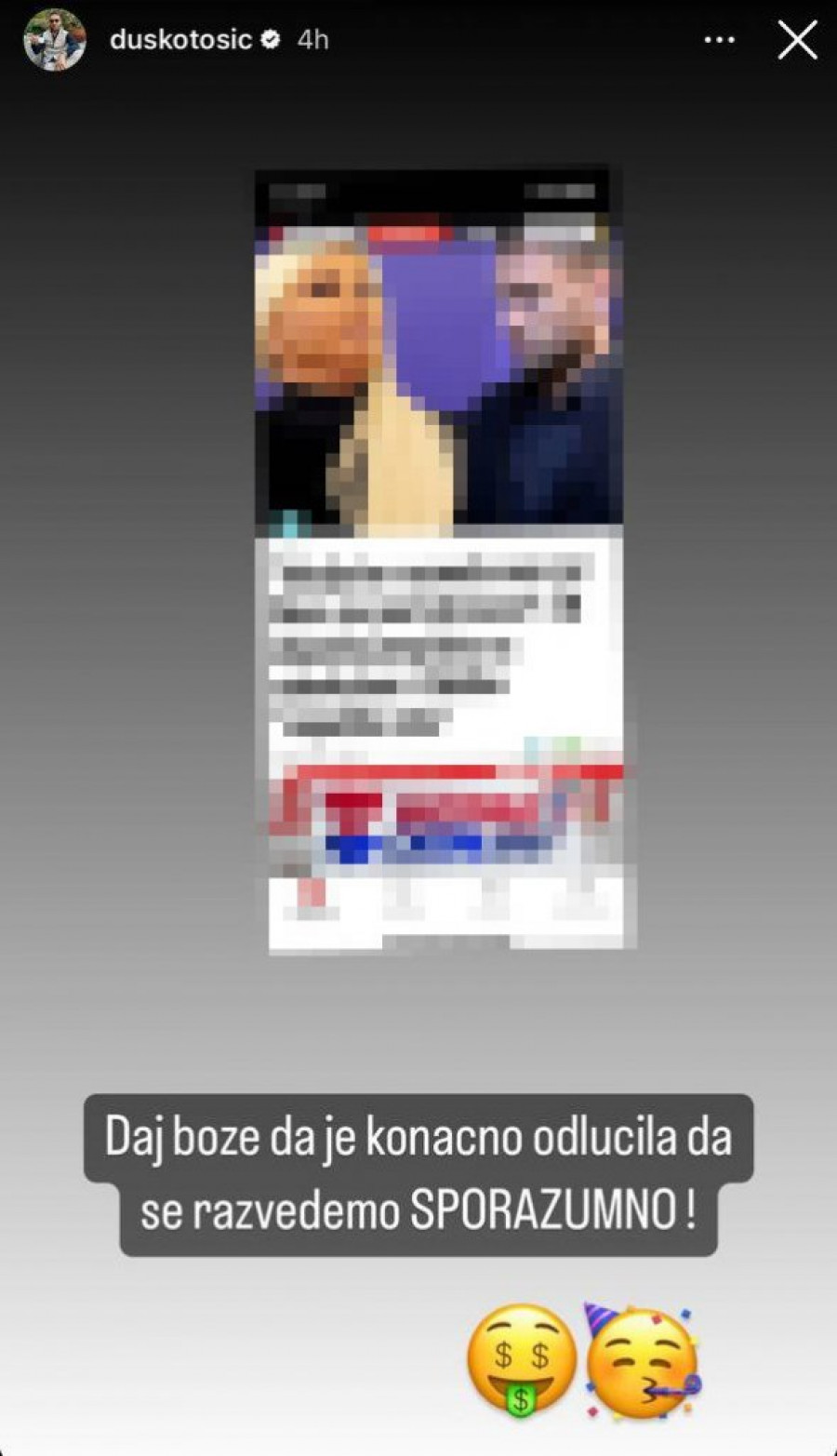 - Daj Bože da je konačno odlučila da se razvedemo sporazumno! - napisao je Tošić uz emotikon koji se plazi i umesto očiju ima dolare, ali se tu nije zaustavio:
